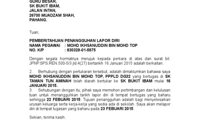 Contoh surat rasmi permohonan penangguhan lapor diri. Perlu memastikan surat rasmi penangguhan ada dibuat.